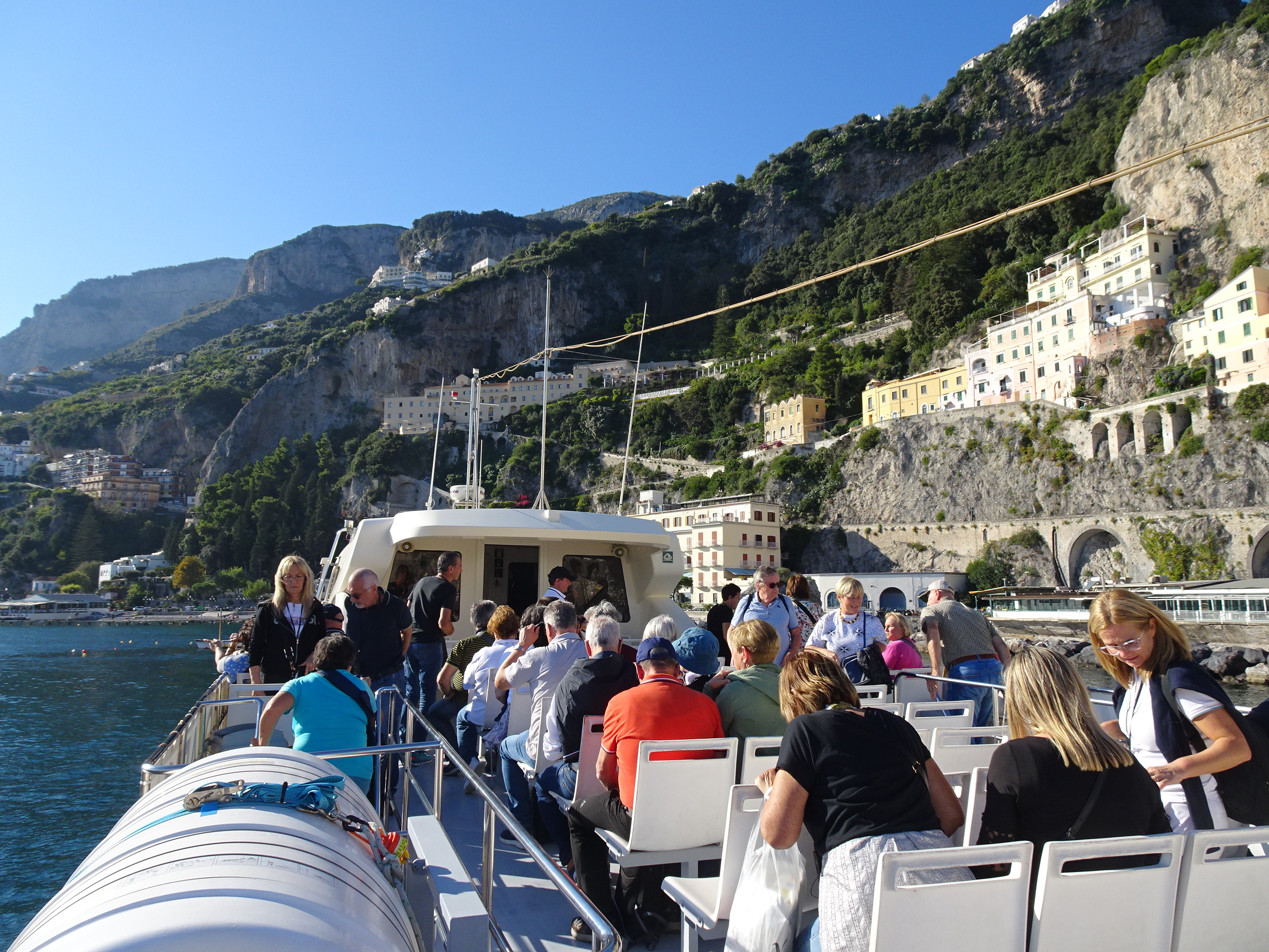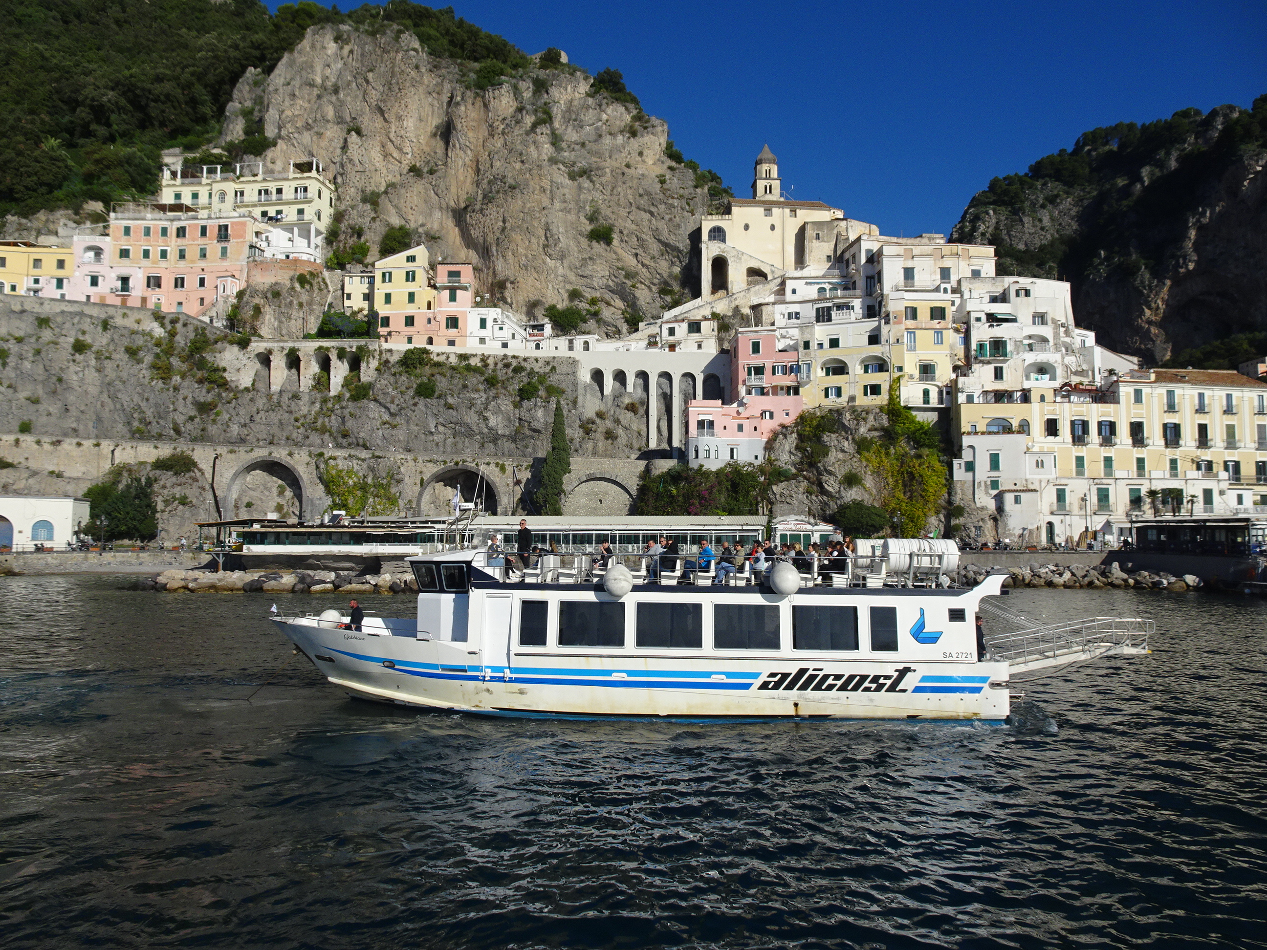Prima zi am petrecut-o pe coasta Amalfi. Din portul Salerno, pleacă mai multe curse regulate spre Amalfi, Positano și celelalte sate de pe coastă. Travelmar este compania care operează cele mai multe dintre ele. Vapoarele lor fac opriri în fiecare localitate sau merg direct către cele mai importante porturi. Există oferte foarte convenabile prin care poți lua tururi cu opriri prestabilite sau nelimitate folosind oricare dintre curse. Tarifele sunt convenabile – eu am ales turul cu 3 opriri iar tariful total a fost vreo 30 de euro.