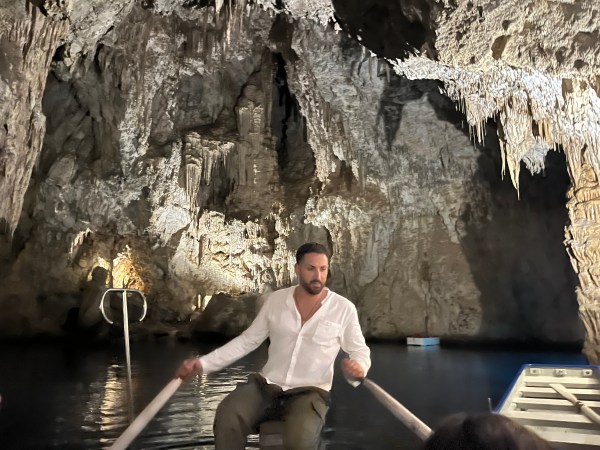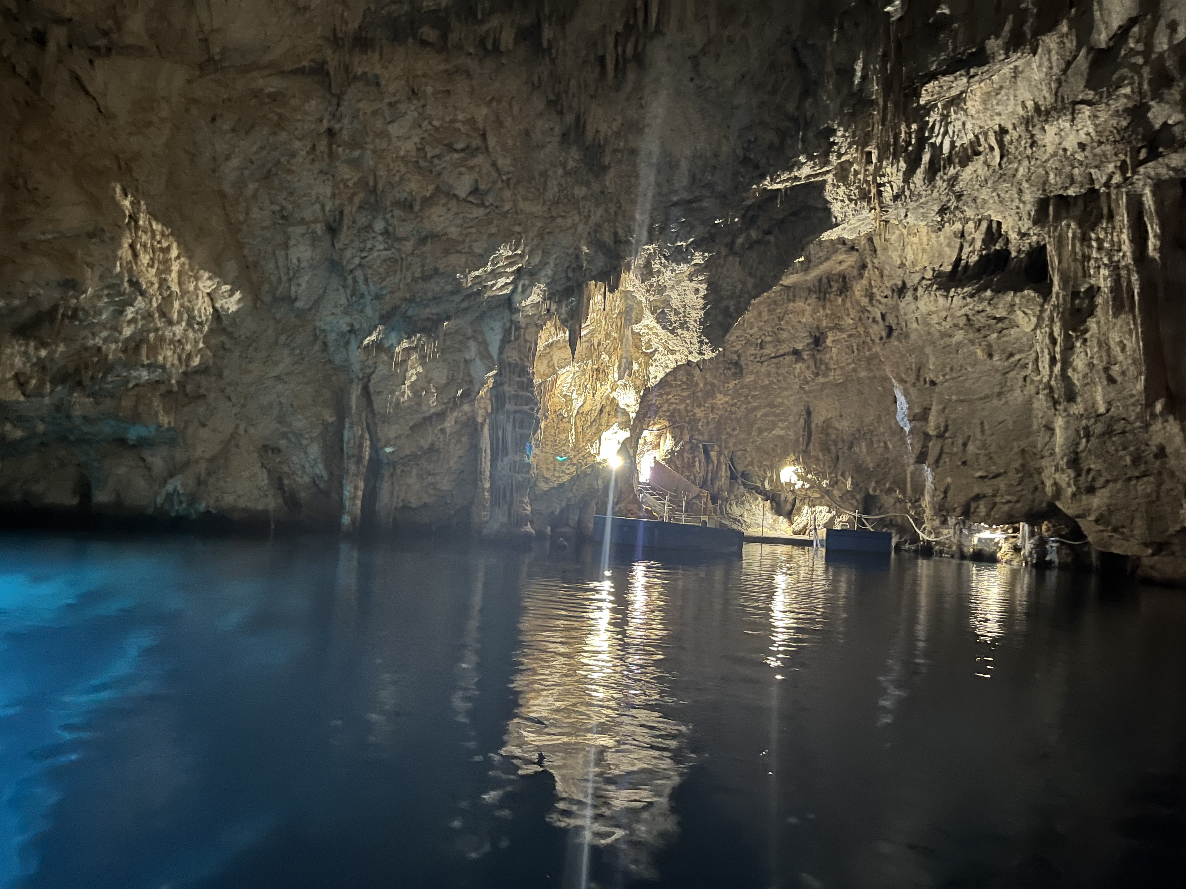 Accesul în peșteră include o plimbare cu barca pe lacul subteran