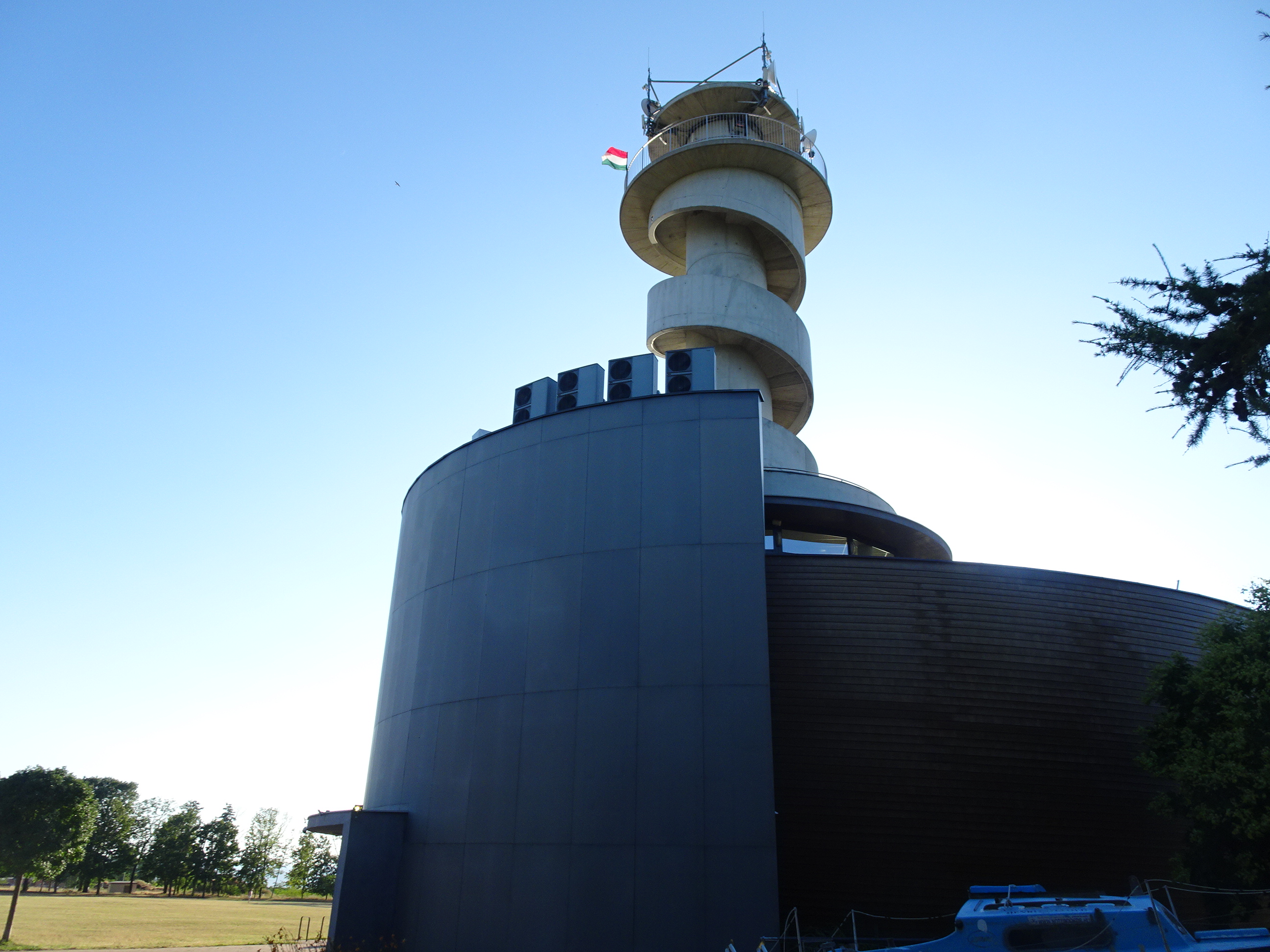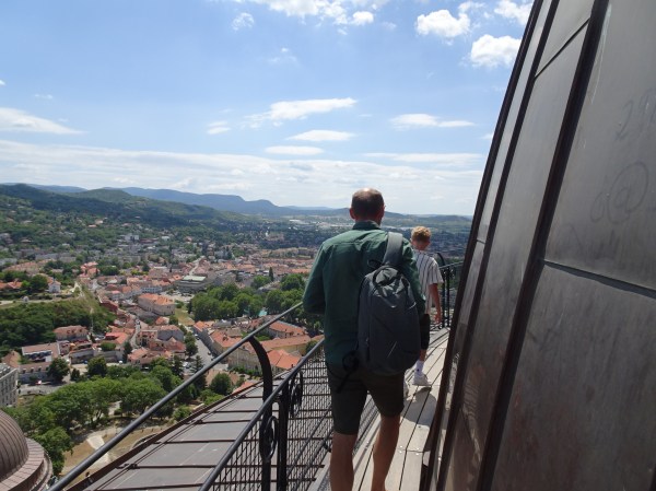 Vederi de pe acoperiș la aproape 100 de metri înălțime. Se vede Dunărea, iar pe malul celălalt este orașul slovac Sturovo