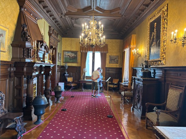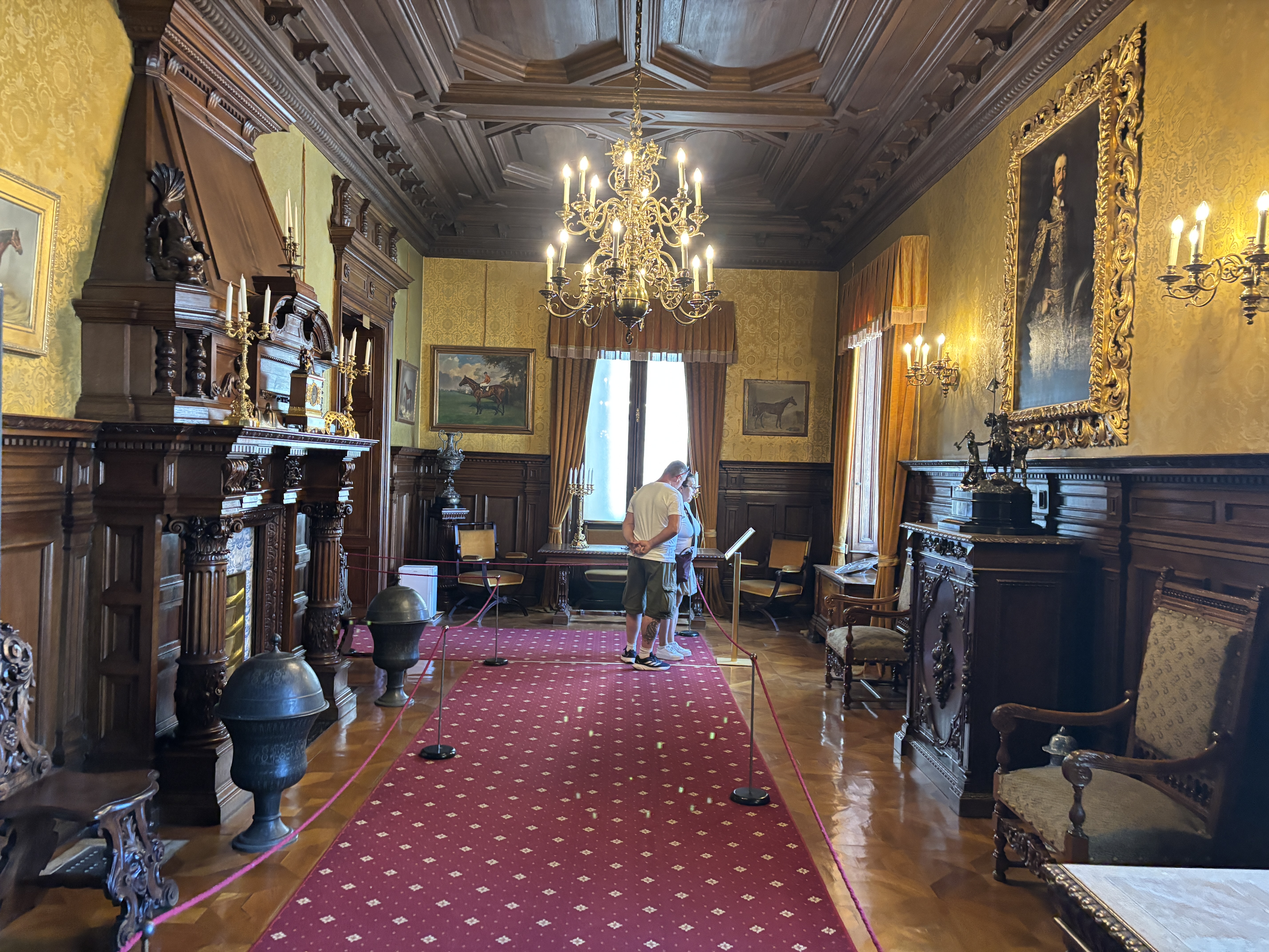 Camerele castelului sunt amenajate cu decoruri medievale și statui de ceară