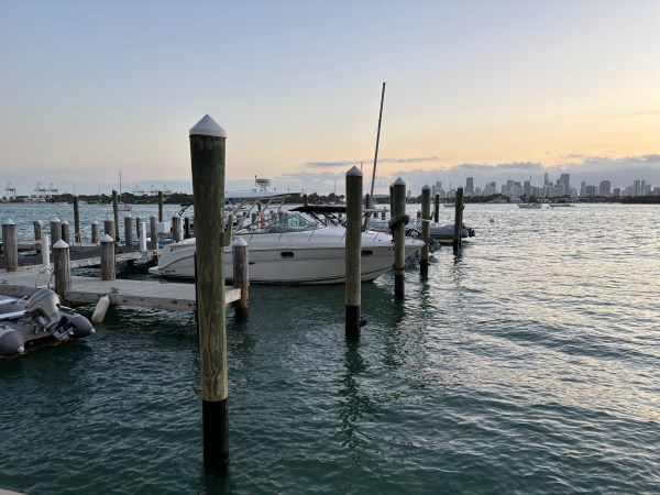 Vederi cu Miami de pe apă. Tot golful e plin de ambarcațiuni de agrement.
