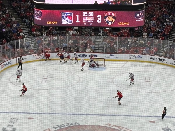 Am plecat cu puțin înainte de final pentru a evita traficul. Când am plecat, Florida Panthers conduceau dar Rangers au răsturnat scorul pe final. Chiar și așa, echipa din Miami a ieșit campioană la finalul sezonului.