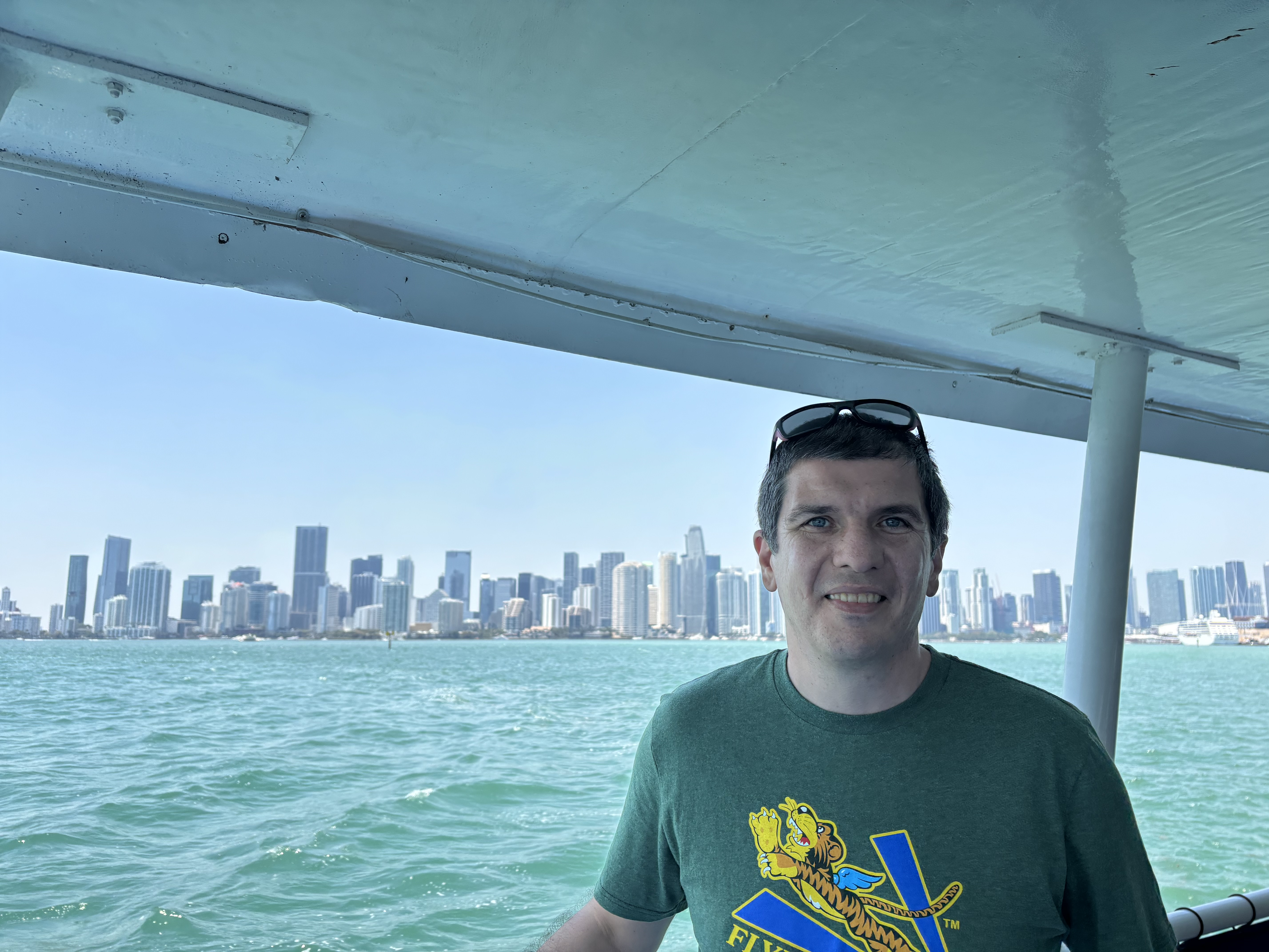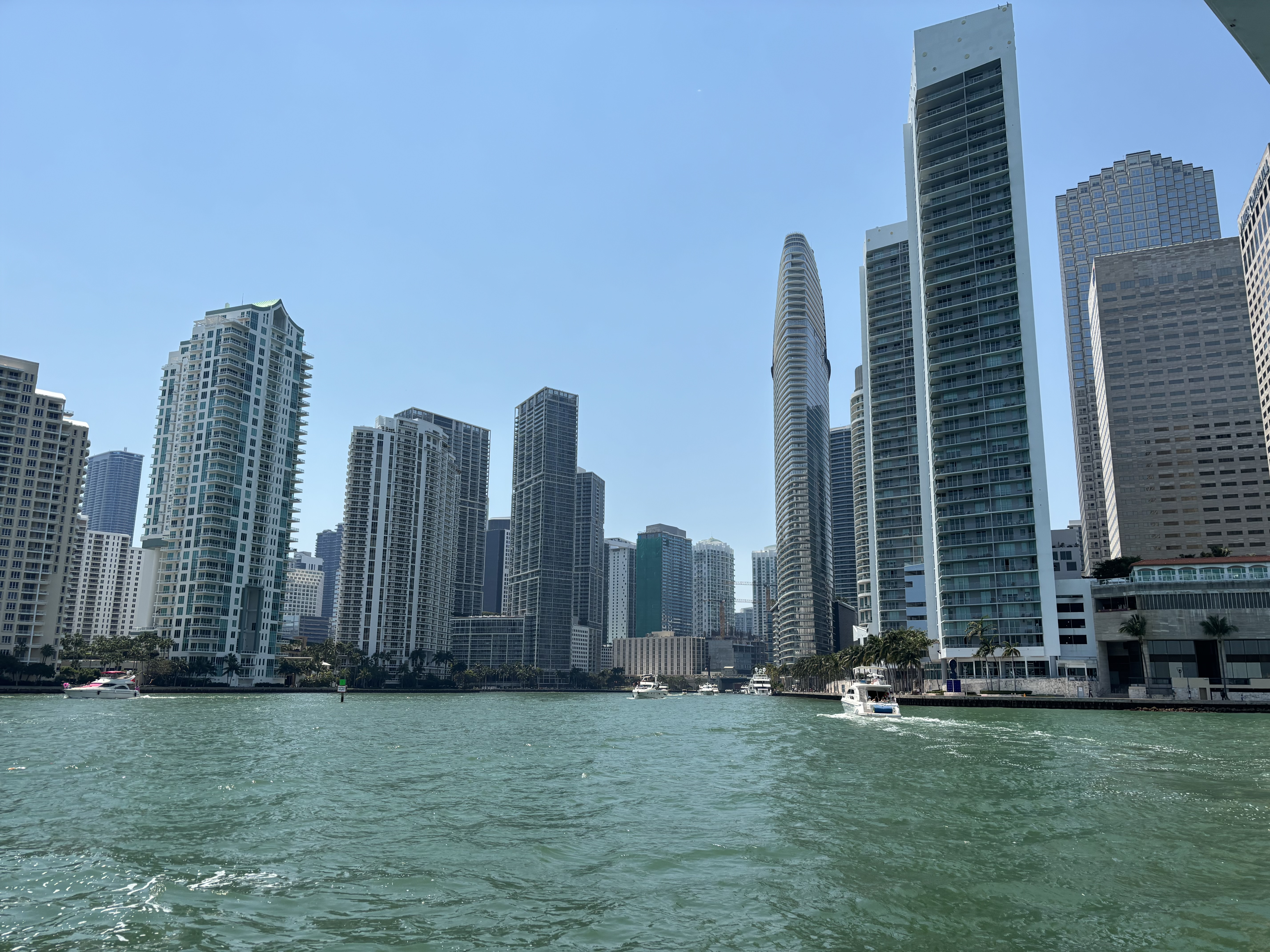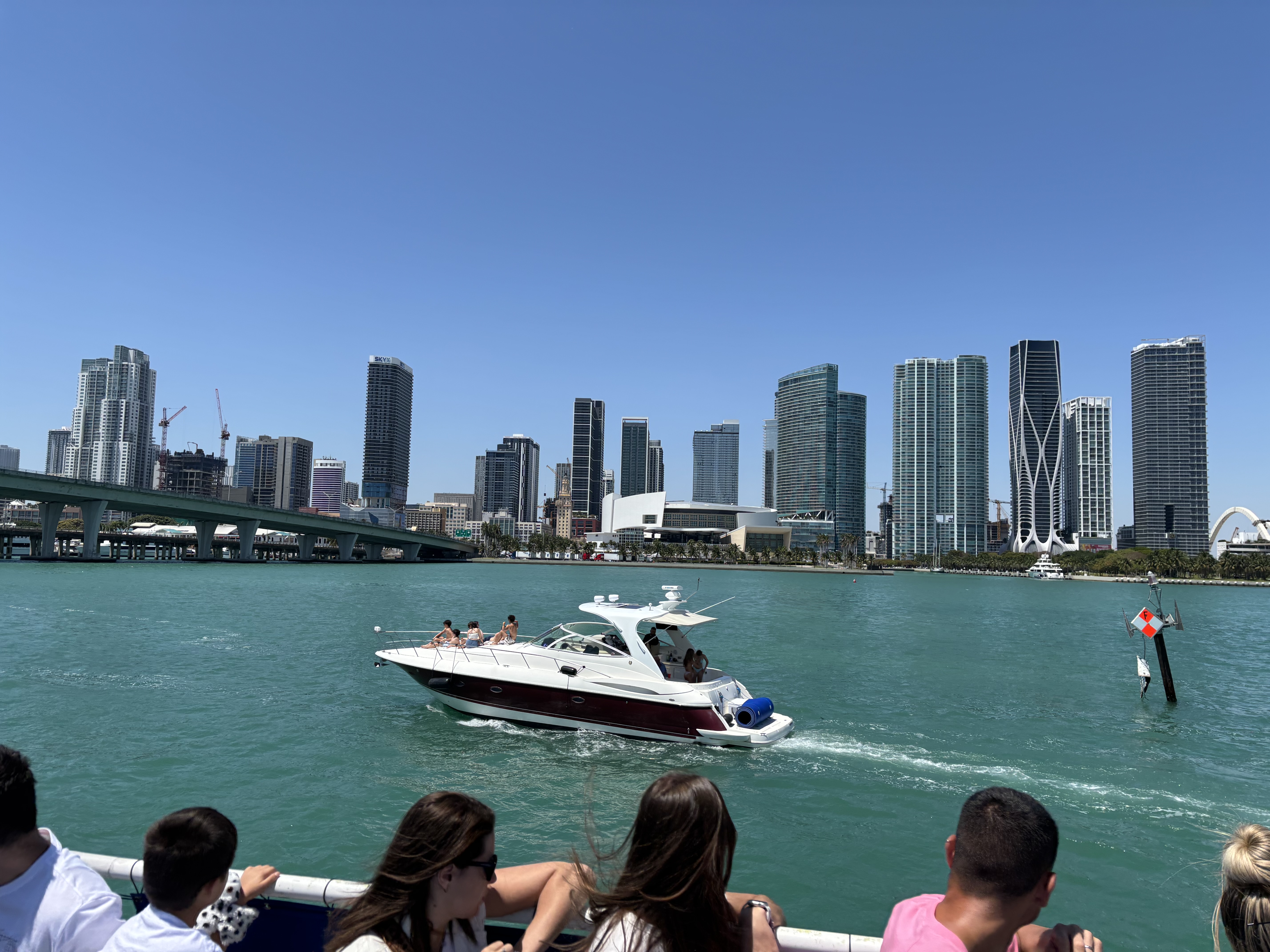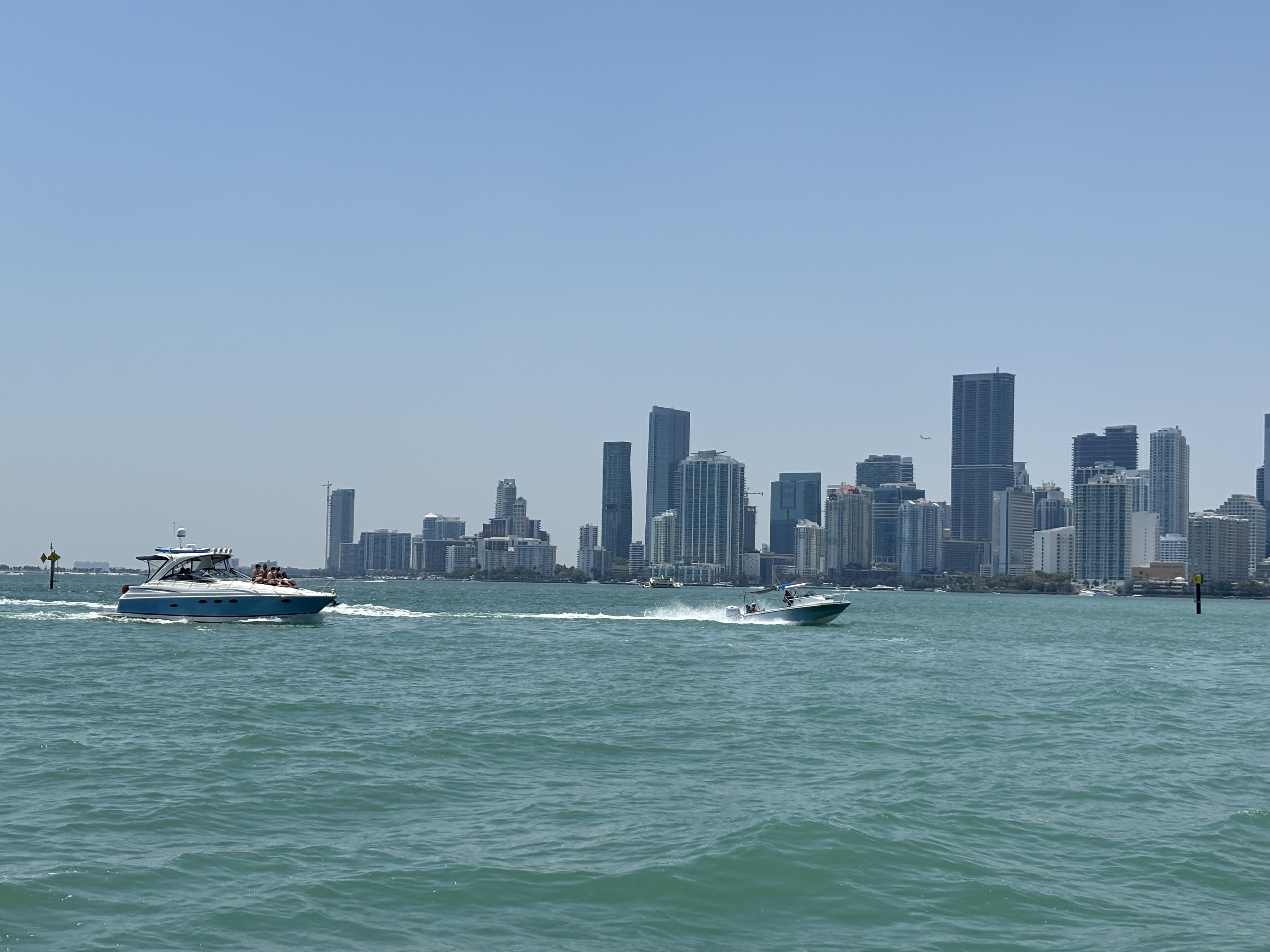Vederi cu Miami de pe apă. Tot golful e plin de ambarcațiuni de agrement.