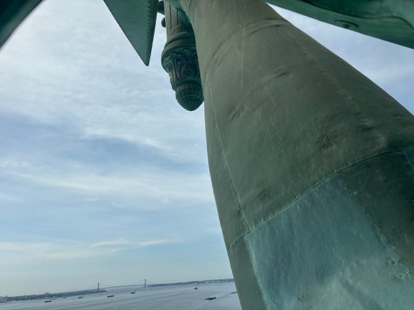 Vedere cu brațul și torța statuii. Acolo nu are nimeni acces. Nici chiar Michael Jackson nu a fost lăsat să filmeze, iar pentru videoclipul Black or White s-a folosit o replică a torței.