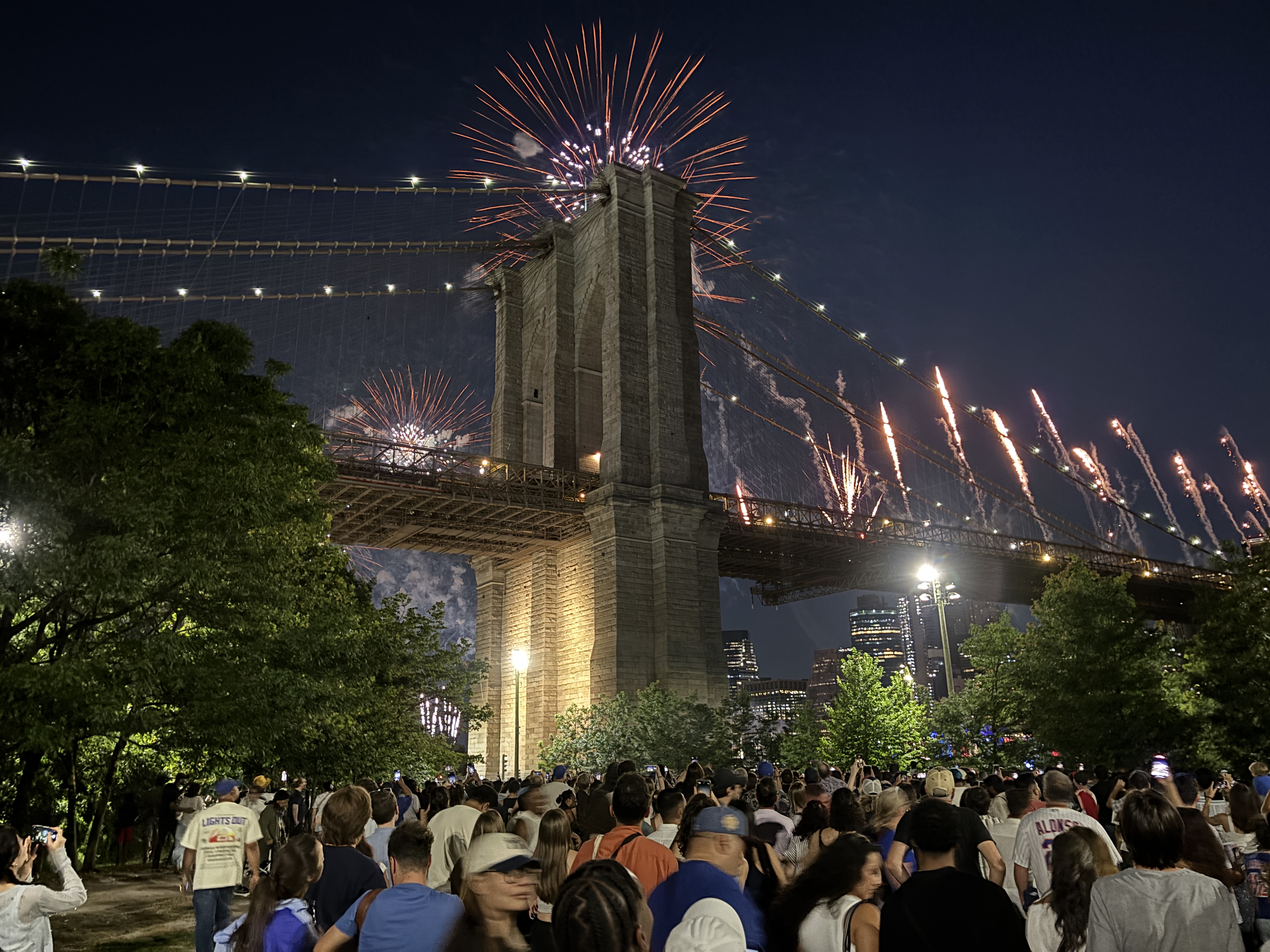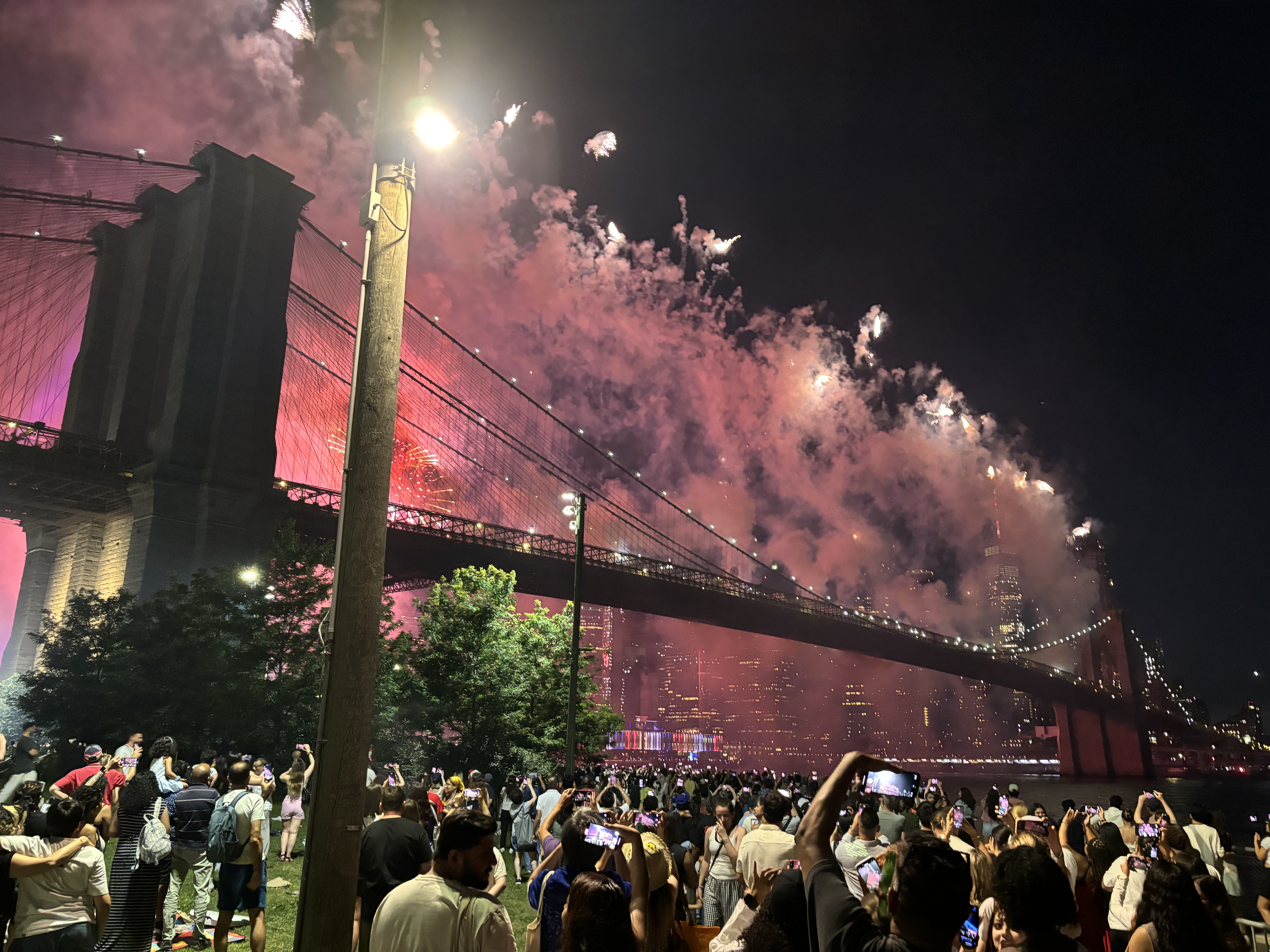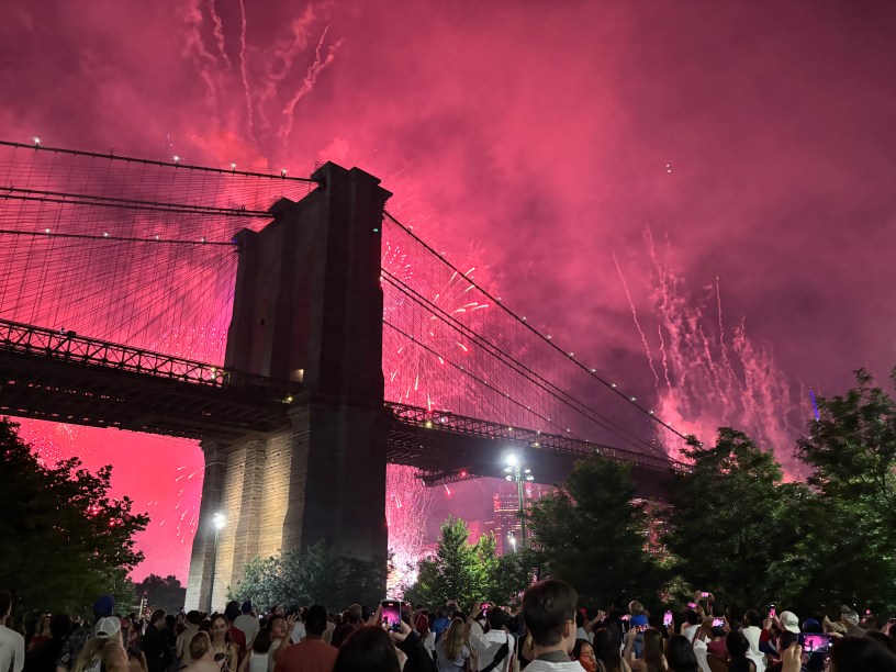 Am prins așadar cu mult noroc o locație grozavă de unde am putut urmări artificiile. Acestea s-au lansat de pe Brooklyn Bridge și de pe barje pe East River în timp ce concertau Lenny Kravitz și Ava Max.