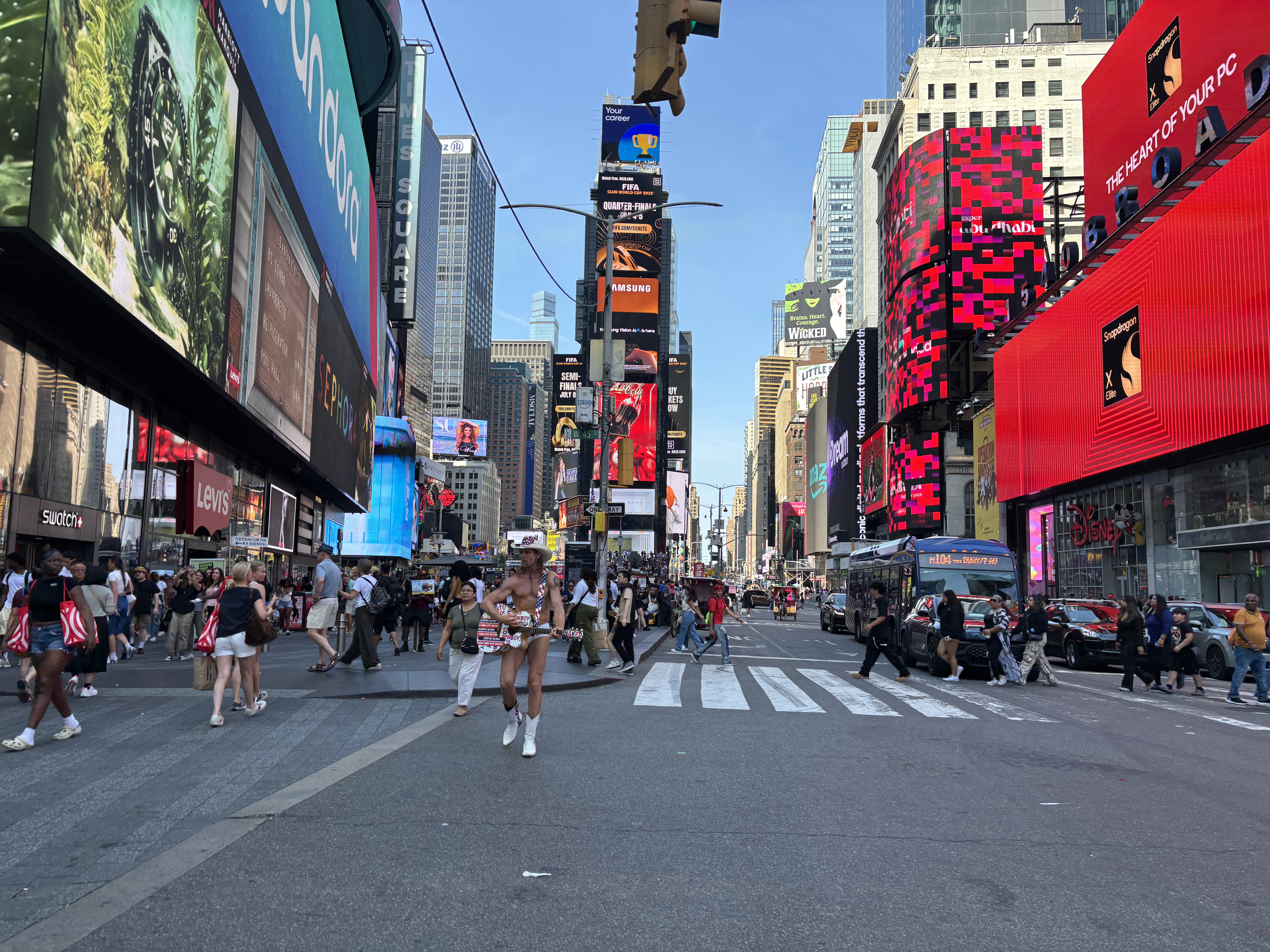 Times Square, cel mai luminat și zgomotos loc din oraș. Cowboy-ul care canta în chiloți și mascotele King Kong și Iron Man sunt personaje pe care le-am întâlnit acolo de fiecare dată.