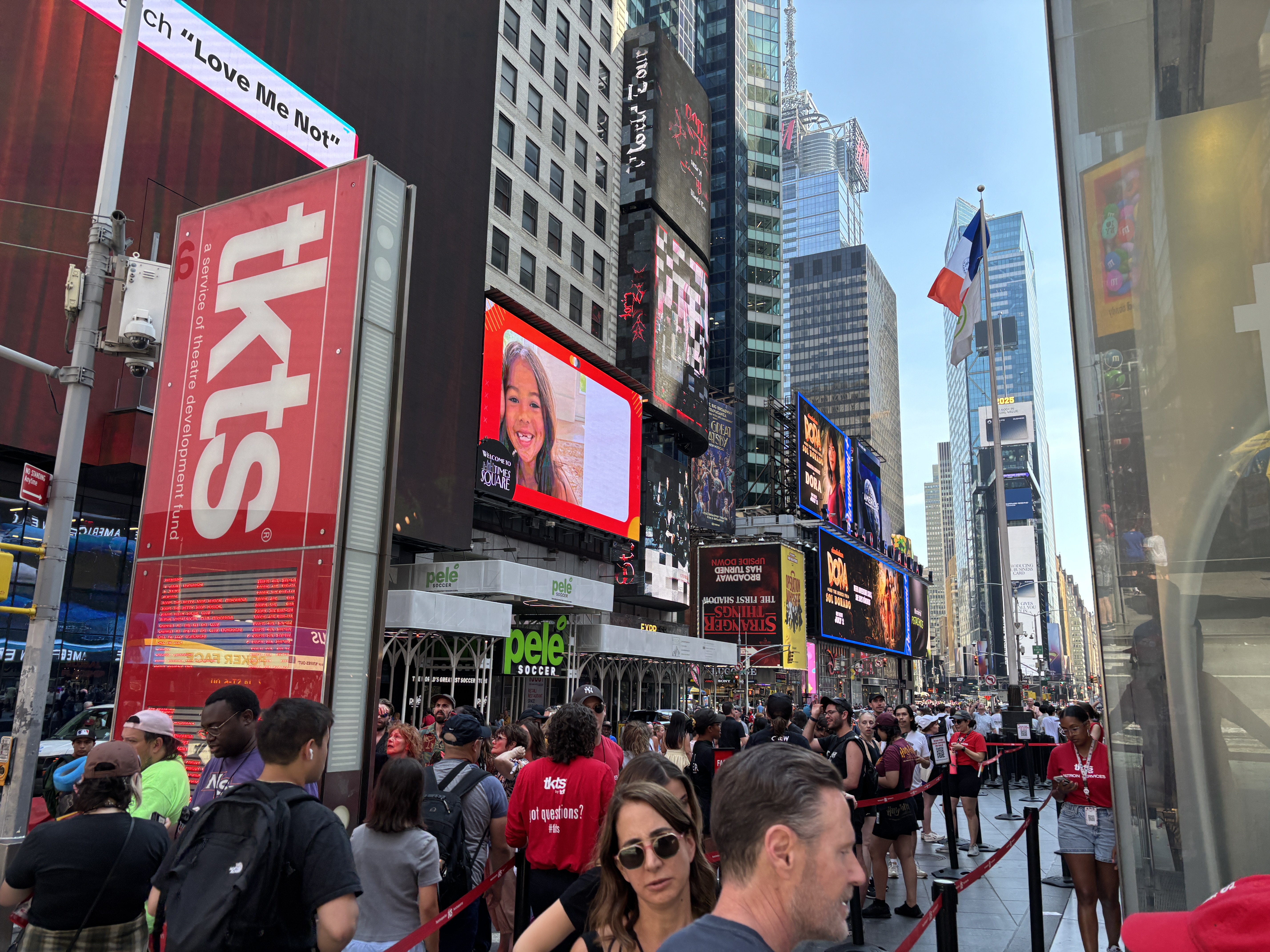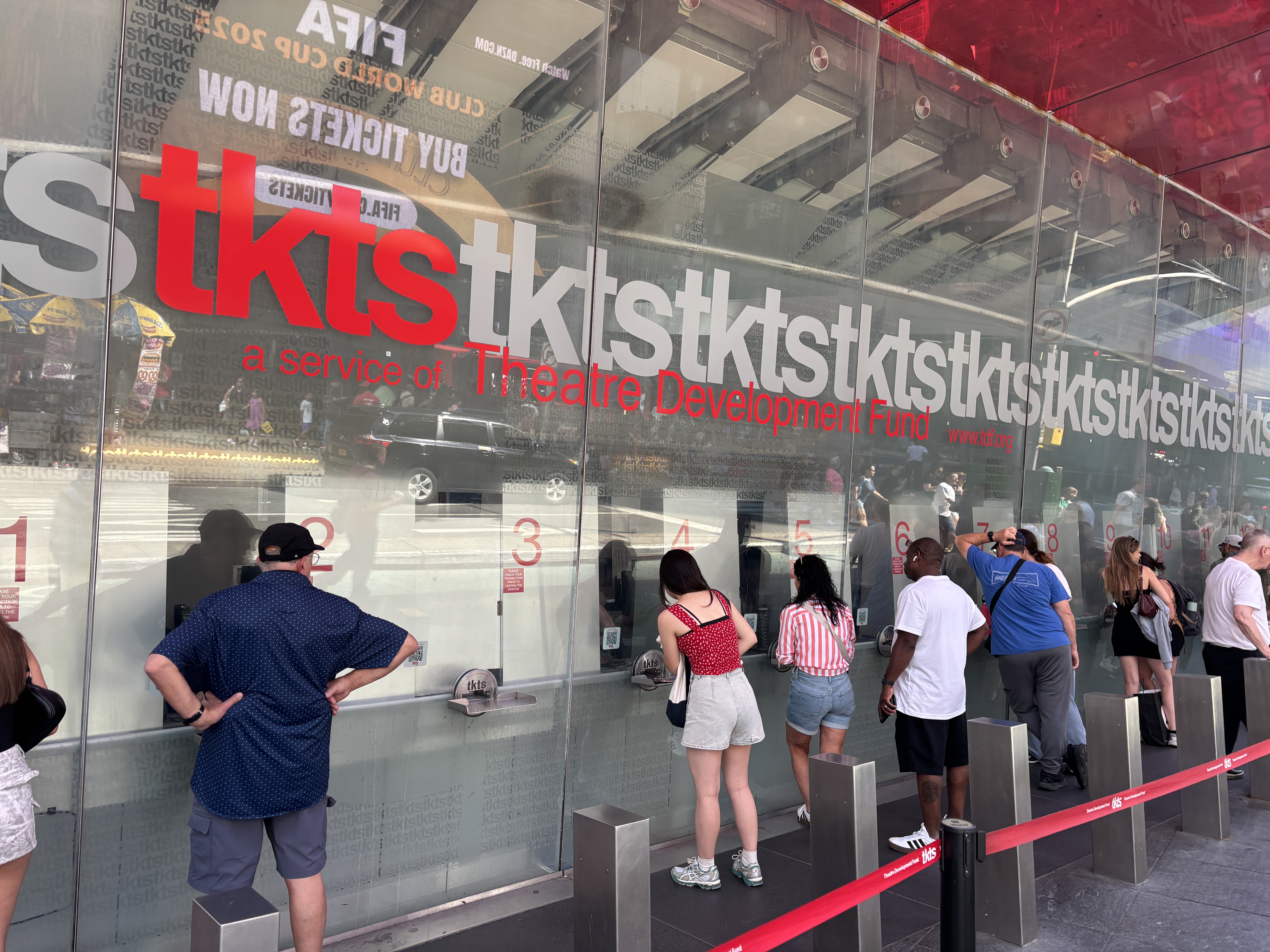 Aproape de Times Square sunt majoritatea teatrelor de pe Broadway. Ne-am dorit să asistăm la un show musical pe Broadway, dar nu aveam bilete rezervate. Pentru situația asta cea mai bună soluție este compania TKTS care are sediul chiar în inima Times Square. Acolo se pot găsi zilnic bilete reduse pentru spectacolele din aceeași seară sau pentru matineul zilei următoare. Reducerile pot fi majore – de la 30% la 70% (prețurile normale box office sunt între 100 și 300 de dolari). Ne-am bucurat să găsim bilete a doua zi reduse la jumătate de preț pentru showul Michael, unul din cele mai bine cotate de pe Broadway. La TKTS, nu am stat la coadă decât vreo 5 minute.