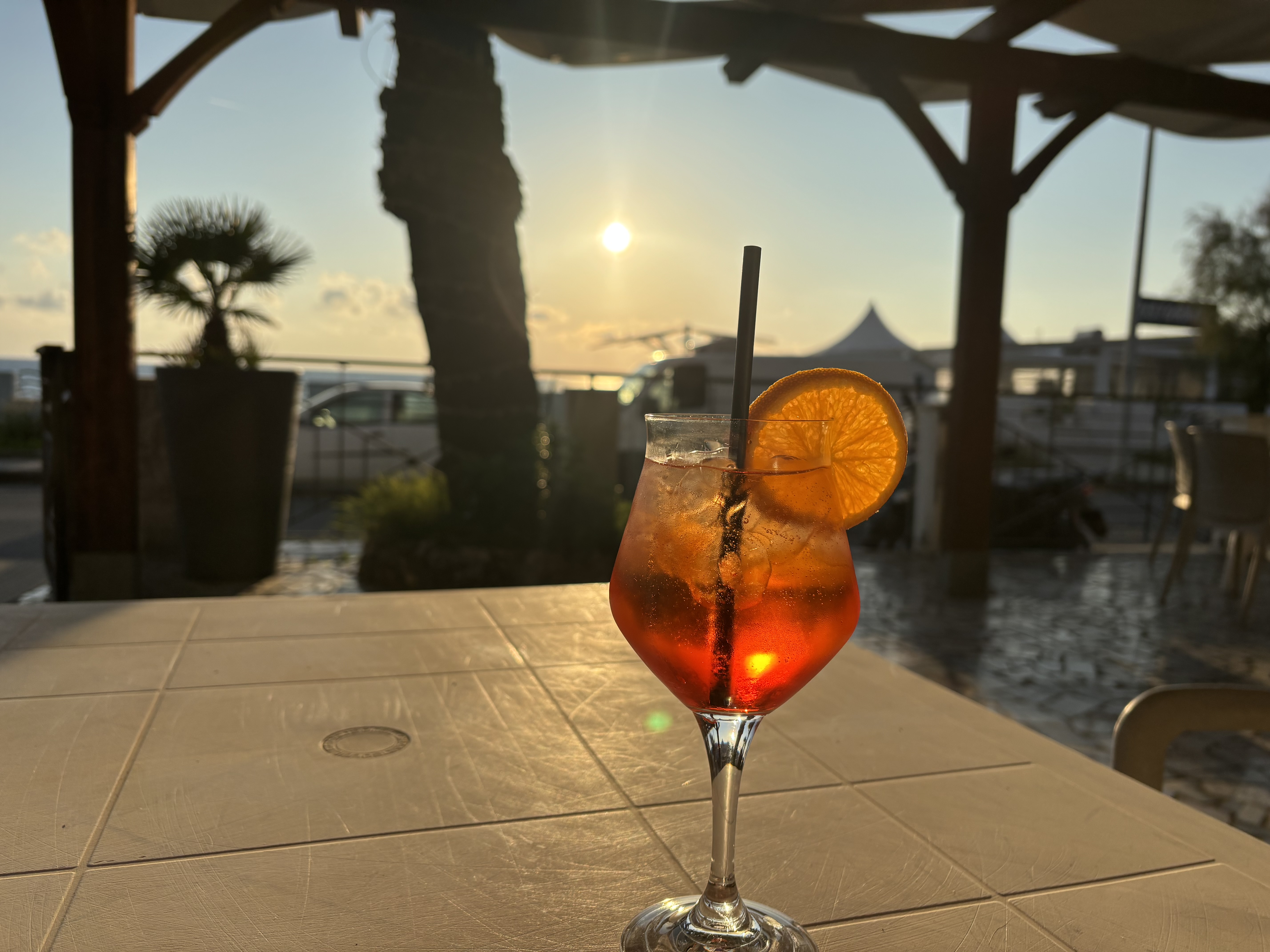 Am servit un cocktail la terasă, admirând cum soarele coboară pe mare.