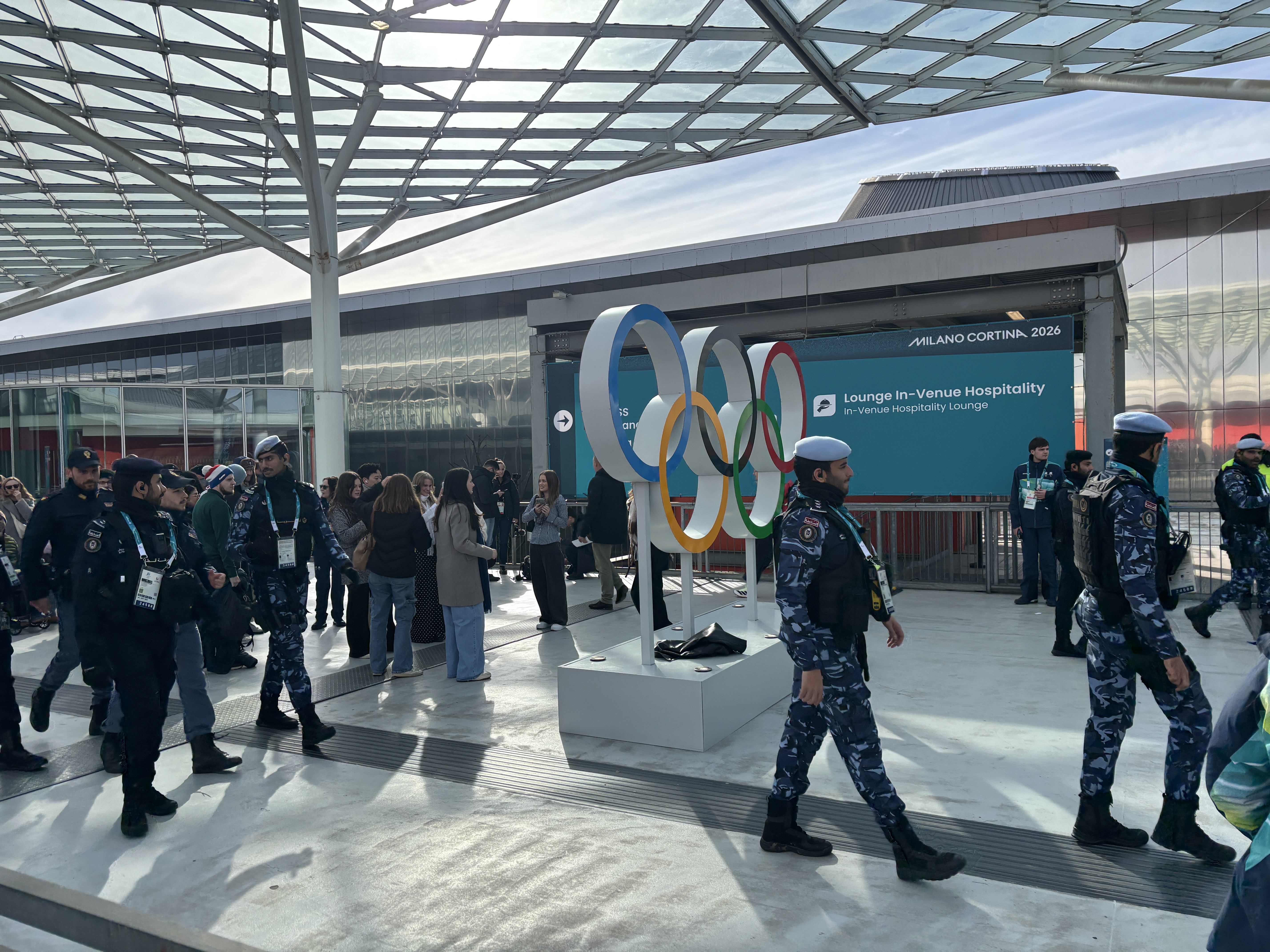 Coadă mare era și la fotografii cu simbolurile olimpice. Am observat că paza era asigurată nu numai de poliția italiană, ci și de unități de securitate de peste tot din jurul lumii. În imagine sunt polițiști din Qatar, dar cel mai controversat detașament a fost al americanilor de la ICE, participare ce stârnise proteste mari prin Milano cu câteva zile în urmă.