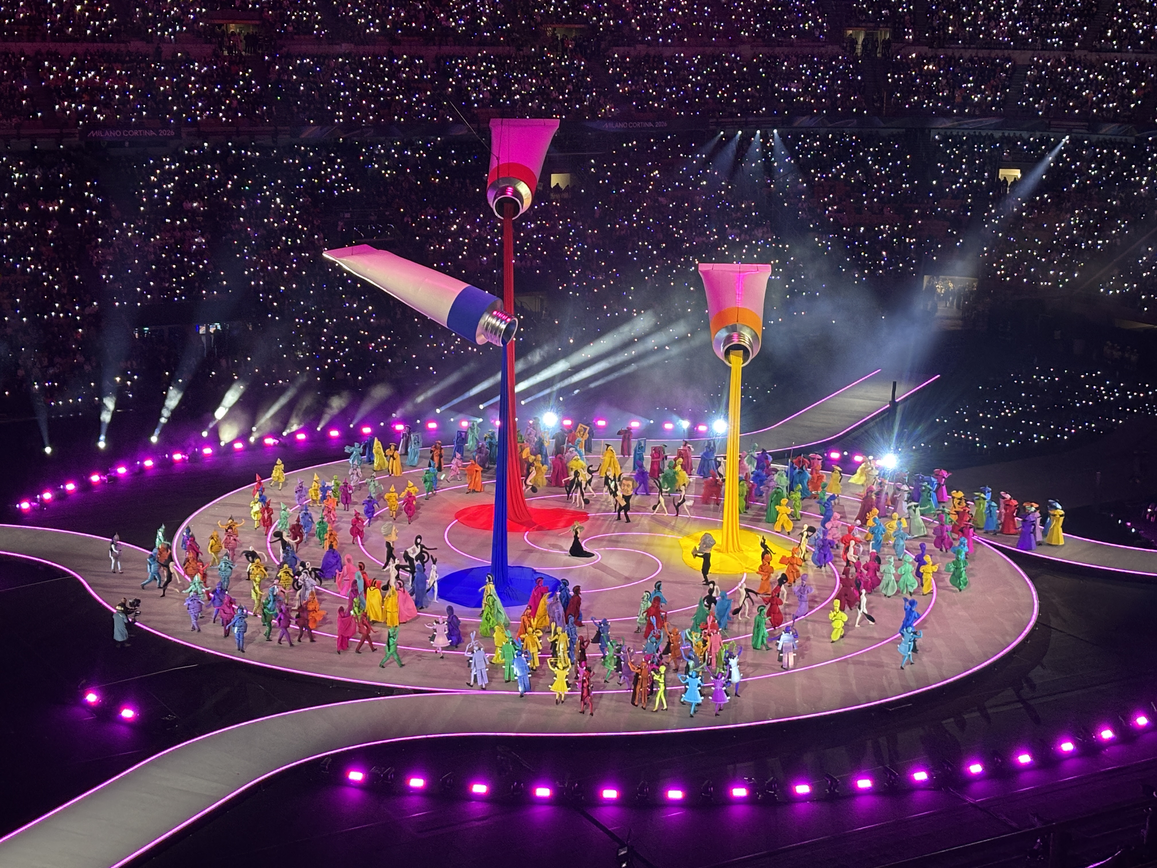 După amiaza am mai trecut pe la apartament, iar la lăsarea serii am plecat spre stadion, unde la 8 seara începea marea ceremonie de deschidere a olimpiadei. Metrourile spre San Siro erau foarte aglomerate deja cu 2 ore înainte de începerea evenimentului